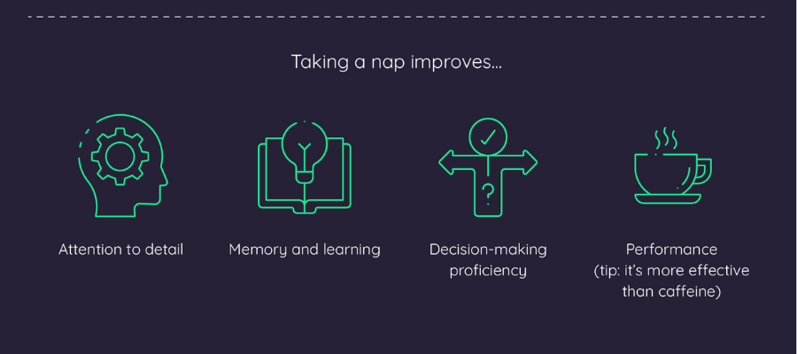 The positive effects of napping don’t stop here. For example, there is promising data to support that naps help against anxiety – a major health issue among health care personnel, among others. Likewise, napping effectively mitigates burnout, which affects up to 77% of the workforce.